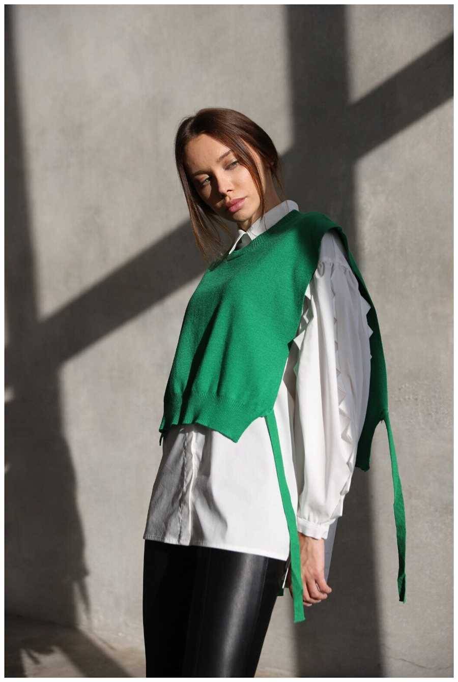 Жилетка на завязках по бокам отличается утонченным дизайном и удобством в сочетании с другими предметами гардероба. Ее особенностью являются завязки по бокам, которые позволяют регулировать объем и форму жилетки, создавая прекрасную посадку и подчеркивая фигуру. Этот элемент одежды подходит как для повседневных образов, так и для деловых встреч или особых случаев.